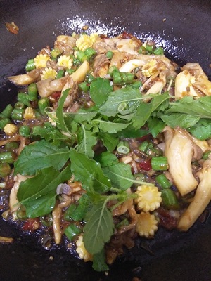 การทำผัดกะเพราก็ง่ายๆ ไม่ยุ่งยากอะไร ก่อนอื่นก็เอาพริกสด ไปโขลกรวมกับกระเทียมให้ละเอียดตามชอบใจ ใส่มากน้อยก็ตามระดับความเผ็ดที่ชอบของแต่ละคน ได้พริกโขลกกับกระเทียมแล้ว ก็นำไปผัดในน้ำมันร้อนๆให้ส่งกลิ่นหอมจามกันทั่วบ้าน ก็นำเนื้อสัตว์ที่เราเตรียมไว้ลงไปผัด ถ้าผัดเห็ดก็นำเห็ดและผักใส่ไปพร้อมๆกันเลย …