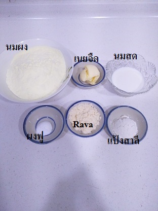 - ราวา หรือ เซโมลิน่า หรือ ซูจี 1+1/2 ช้อนโต๊ะ