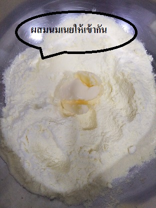ใส่นมสดของเราลงไป พลอยศรีตวงนมไว้ 3 ช้อนโต๊ะ ใส่ลงไป เอาปลายนิ้วตะล่อมๆให้แป้งจับตัวกันเบาๆ ไม่ต้องนวดแรง เพราะลูกแป้งจะแน่นกินไม่อร่อย ลูกแป้งควรจะมีความนุ่มเหมือนลูกทองหยอดของไทย …