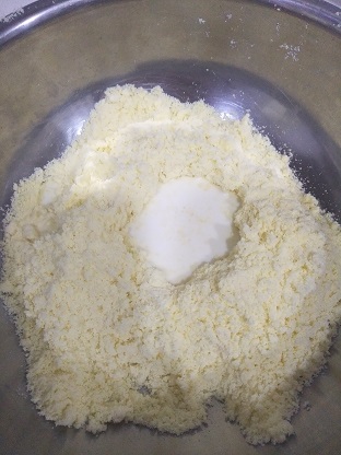 เริ่มทำกันเลยค่ะ เริ่มแรก ให้นำส่วนผสมลูกนมทั้งหมดเทผสมกัน และคลุกเคล้าให้เข้ากันอย่างเบามือ สามารถนำทุกอย่างใส่ไปได้ในทีเดียวเลย แต่พลอยศรีเคยทำแล้วปรากฏว่าลูกนมจะมีความแข็งไม่นุ่มนวลเพราะเรานวดกดแรงและนานไปกว่าทุกอย่างจะเนียนดี พลอยศรีจึงค่อยๆแยกใส่ผสมกันทีละส่วน โดยเริ่มจาก การผสม นมผงและเนยสดให้เข้ากันก่อน โดยใช้มื้อเคล้าๆ ถูๆกับฝ่ามือเบาๆ จนผสมกันร่วนๆแบบเนื้อทราย