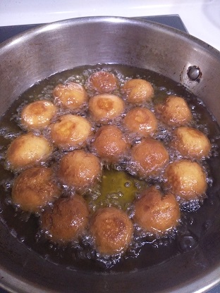 เมื่อปั้นลูกนมจนหมดแล้ว เราก็นำน้ำมันสำหรับทอดใส่กระทะ จะใช้เนยใส ( Ghee)ก็ได้นะ แต่พลอยศรีทอดในน้ำมันปาล์มเลย *** น้ำมันตั้งไฟอ่อนๆพอน้ำมันอุ่นๆ ห้ามร้อนนะ เพราะถ้าน้ำมันร้อนแป้งจะแตก ค่อยๆใส่แป้งที่ปั้นไว้ลงไปทอด ทิ้งไว้สักครู่ กะว่าแป้งทอดอยู่ตัว ก็ยกกระทะเขย่าเบาๆ ไม่ต้องคนนะ เดี๋ยวแป้งแตก เขย่าๆให้ลูกนมหมุนไปมา ให้โดนความร้อนทั่วกัน