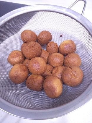 วันเวลาผ่านไปครบ 10 นาทีแล้ว เราก็มาเปิดฝาดู และทำการปั้นนมเป็นลูกกลมๆ ขนาดก็ตามต้องการเลย ใหญ่เล็กตามใจปรารถนา พลอยศรีปั้นลูกไม่โตมาก ขนาดโตกว่าลูกเชอร์รี่ลูกลำไยนิดเดียว เพราะเดี๋ยวเวลาที่เราทอดแล้ว แป้งจะพองตัว และเวลาที่เรานำไปแช่น้ำเชื่อมแป้งก็จะขยายอีกนะ