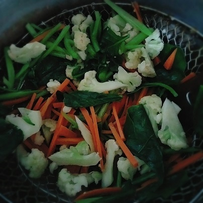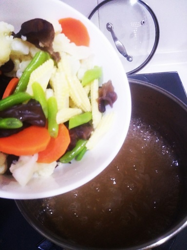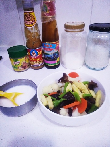 วันนั้นแคททำกับหมูหมัก แต่วันนี้พลอยศรีจะทำกับผักรวม เพราะพลอยศรีชอบแบบนี้ ส่วนใครชอบหมูหมักก็ใส่เพิ่มตามใจชอบ
