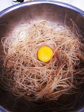 เอาเส้นหมี่ที่เราแช่น้ำไว้จนนุ่มแล้ว คลุกกับซีอิ้วดำพอประมาณ (ใส่มากก็ดำมาก) จากนั้นตอกไข่ลงไป คลุกให้ทั่วเส้น