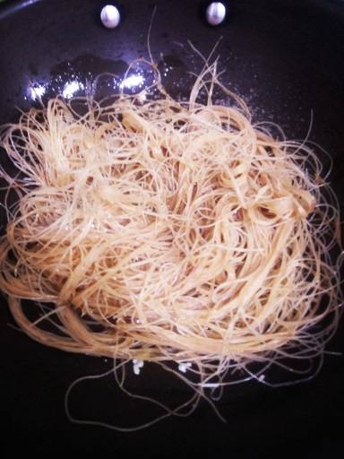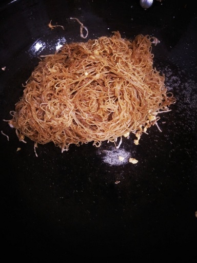ตั้งน้ำมันให้ร้อน ใส่กระเทียมสับลงไปผัดพอหอม นำเส้นหมี่ลงไปผัดจนสุกนิ่ม มีกลิ่นไหม้ๆหน่อย หอมอร่อยดี ผัดเสร็จก็ใส่ชามพักไว้