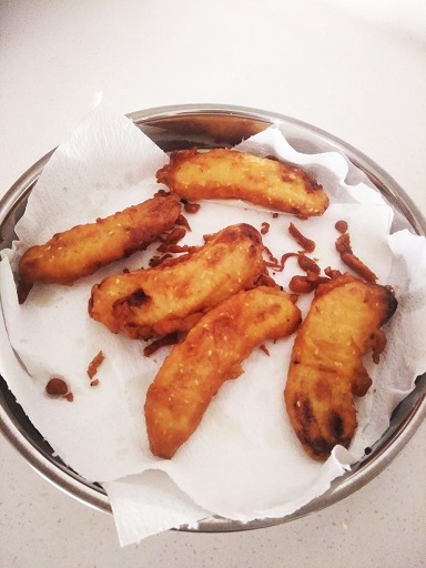 เอามาทอดกล้วยแขกกินด้วยค่ะกรอบเสียงสนั่นเลย แค่ผสมแป้งกับน้ำเย็นแล้วใส่น้ำตาลทรายลงไป เกลือเล็กน้อย งาขาวนิดหน่อย ชิมแป้งหวานๆเค็มๆพอใจ ก็เอากล้วยชุบแป้งทอดเลย ไม่ได้ใส่น้ำปูนใสเลย ไม่ต้องใส่ไข่ด้วย ง่ายๆแบบนี้ ผู้ชายพลอยศรีร้องขอกล้วยทอดสองวันติดเลยค่ะ พลอยศรีทอดกล้วยสองวันหมดหวี กินกันสองคน ฮาฮา เรื่องความข้นของแป้งก็ดูว่าแป้งไม่เกาะหนาไปบางไป (ถ้าหนาไปก็เพิ่มน้ำเย็น ถ้าบางไปก็เพิ่มแป้ง)