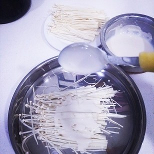 - ตีส่วนผสมแป้งให้พร้อมใช้ ตั้งกระทะน้ำมันให้ร้อน นำเห็ดเข็มทองมาฉีกเป็นช่อตามต้องการ