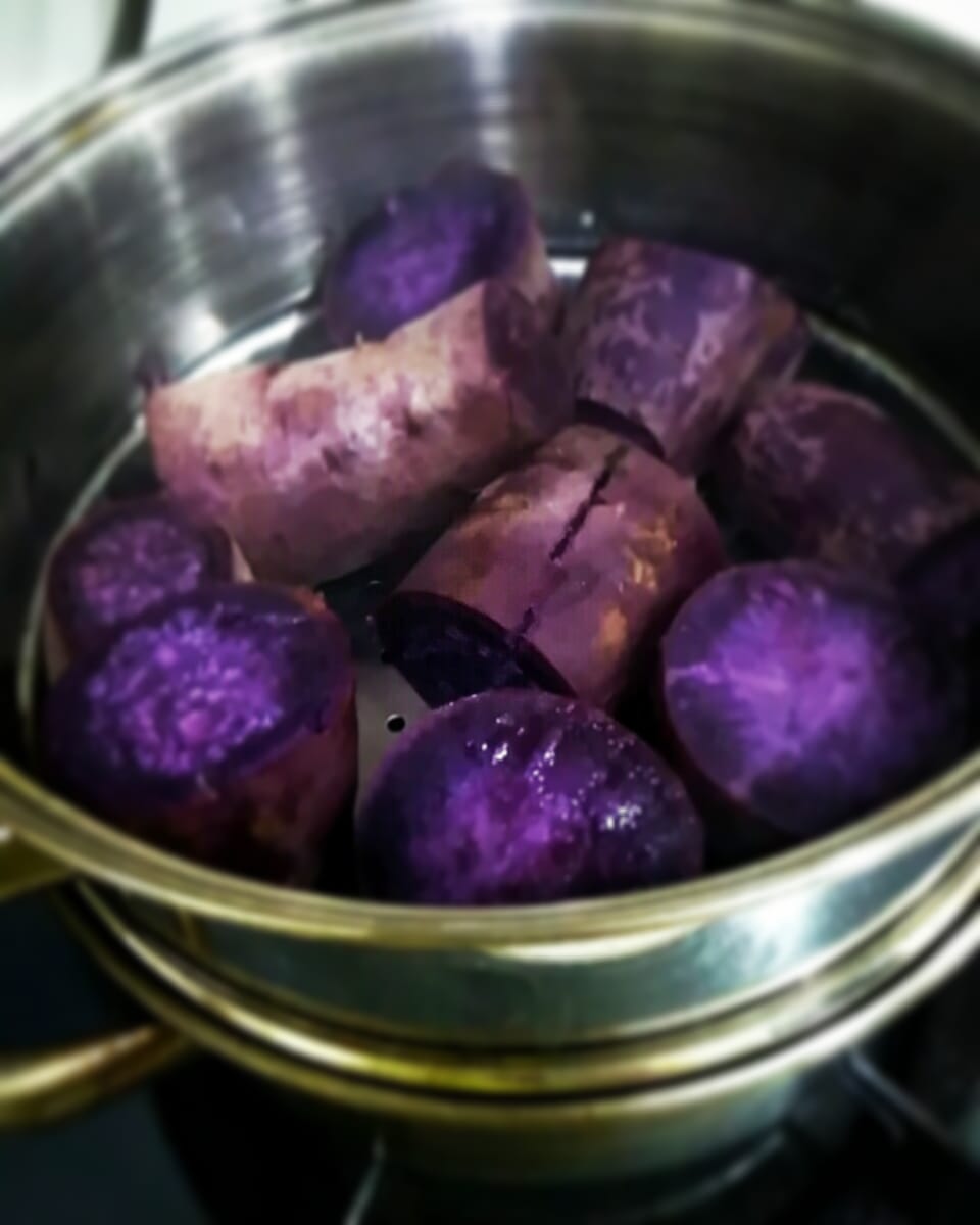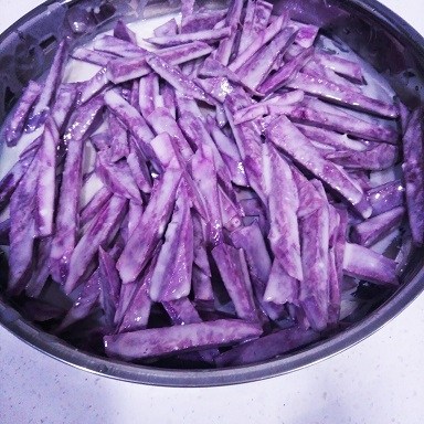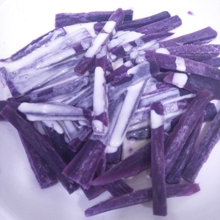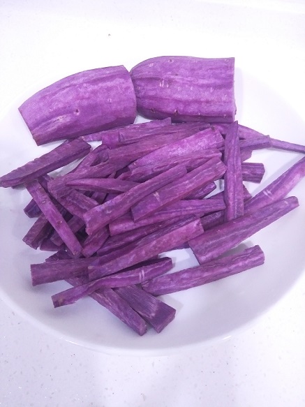 เริ่มแรกให้เรานำมันม่วงมาหั่นเป็นแท่งๆตามขนาดที่เราต้องการ แล้วนำไปใส่ลังถึงนึ่งประมาณ5นาที เพื่อให้มันสุกสักหน่อย (บางคนไม่นึ่งจะทอดเลยก็ได้ แต่พลอยศรีเอาหลักการของการทอดมันฝรั่งเพื่อทำเฟรนซ์ฟรายมาใช้ คือการต้มมันฝรั่งก่อนแล้วทอดจะทำให้ชิ้นมันสุกทั่วถึงและใช้เวลาไม่นานในการทอด) พอดีพลอยศรีนึ่งมันส่วนหนึ่งด้วยเลยนึ่งซ้อนไปพร้อมกันเลย จะได้ไม่เสียเวลาและประหยัดแก็ส