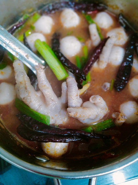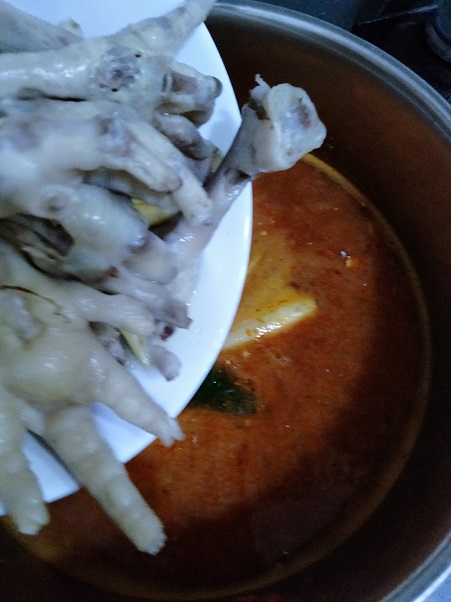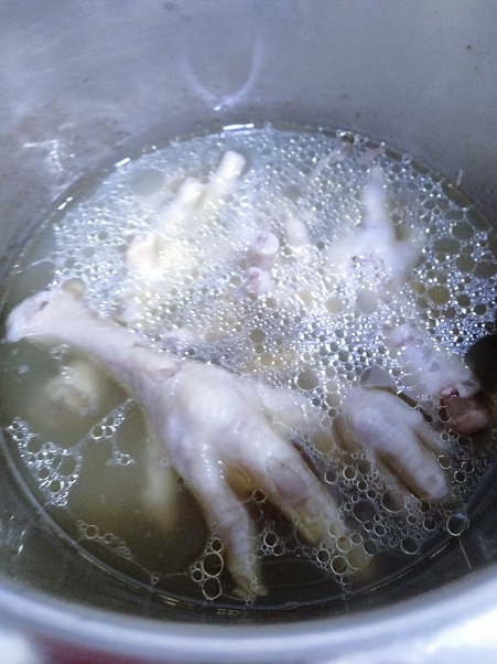 ปะไปทำกัน เริ่มแรกเอาขาไก่มาตัดเล็บทำความสะอาดให้เรียบร้อย แล้วก็เอาไปต้มกับตะไคร้ใบมะกรูดเพื่อช่วยดับกลิ่นคาวต่างๆ ต้มจนเปื่อยพอใจก็ตักขึ้นพักรอไว้