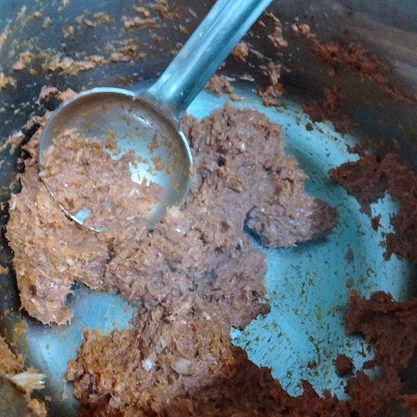 ได้ปลาบดมาแล้ว ก็เอาไปผัดกับน้ำมันพืชสักหน่อย ผัดเพื่อให้มันหอมๆ ให้ความร้อนจากน้ำมันดึงเอาความหอมของเครื่องแกงออกมา เราผัดไปจนรู้สึกพอใจ