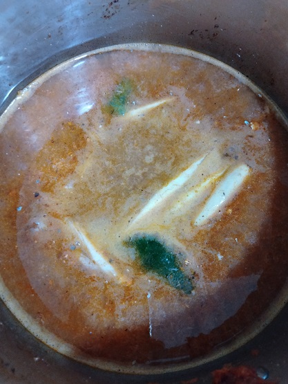 พอใจแล้ว เราก็เติมน้ำสะอาดลงไป แล้วรอให้น้ำแกงเดือดก็ใส่ใบมะกรูด กระชายซอย และตะไคร้ลงไป ต้มจนเดือดปุดๆสัก 1 นาที เพื่อดึงเอาศักยภาพความหอมของสมุนไพลออกมา