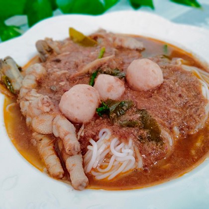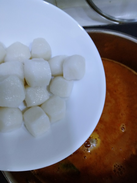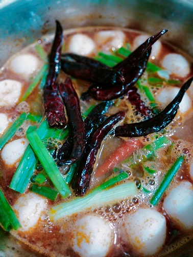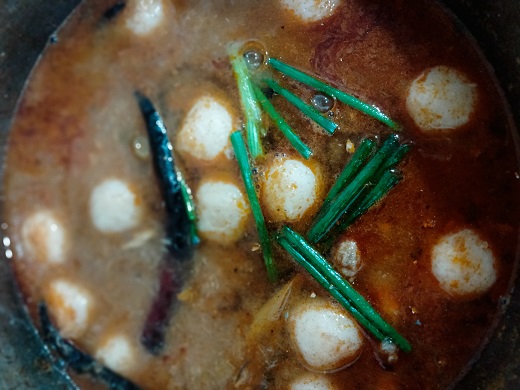 ได้กลิ่นหอมๆ ใส่ขาไก่ที่ต้มสุกและลูกชิ้นปลาตามลงไปได้เลยไม่รีรอ