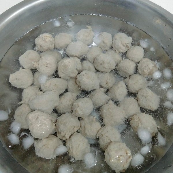 พอลูกชิ้นลอยตัวขึ้นมาแล้ว เราก็ตักออกและเอาไปแช่น้ำเย็นจัดทันที ขั้นตอนนี้เป็นการน๊อคสุกอีกที เคยฟังการเล่าของเชฟเค้าบอกว่า การที่เราตักขึ้นมาน๊อคด้วยน้ำเย็นจัดทันทีเนื้อจะตกใจทำให้เกิดการหดชะงักอะไรเนี่ยแหละ ลืมแล้วอาจจะผิดพลาด แต่ก็ประมาณนี้แหละ ตักขึ้นมาแช่น้ำเย็นจัดเพื่อความเด้งที่เค้าบอกต่อๆกันมา แล้วเราก็ทำตามต่อๆกันไป ฮาฮา