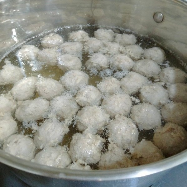 ระหว่างที่นวดๆให้ลูกชิ้นหลังจากออกจากตู้เย็นเราก็ตั้งน้ำเพื่อต้มลูกชิ้นรอไปพลางๆ ต้มให้น้ำเดือดพล่านเลย เสร็จแล้วเบาไฟสุดให้น้ำนิ่งสนิท เพื่อป้องกันลูกชิ้นแตกซุย เราเบาไฟน้ำนิ่ง แต่น้ำมีความร้อน เราหย่อนลูกชิ้นลงไป ลูกชิ้นจะค่อยๆสุกแบบช้าๆ พอสุกแล้วก็จะลอยตัวขึ้นมาเอง