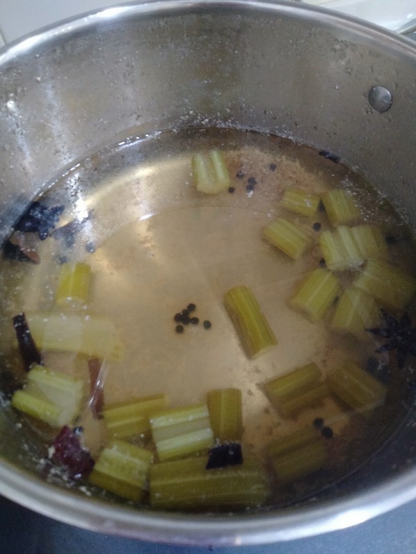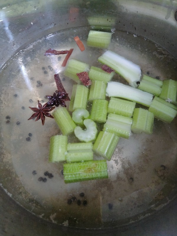 ทีนี้น้ำต้มลูกชิ้นเมื่อสักครู่ กรุณาอย่าได้ทิ้ง เพราะว่ากลิ่นเนื้อหอมกรุ่นมากเลย พลอยศรีจัดการ เอาเครื่องเทศที่เรามีในบ้านใส่ลงไป อันได้แก่ ไม้หอมอบเชย โป๊ยกั๊ก พริกไทยดำ เกลือนิดหน่อย และใส่ต้นเซอลารี่ ขึ้นช่ายฝรั่งลงไป (จะใส่สามเกลอก็ได้ แต่พอดีมีเซอลารี่ต้นใหญ่ เลยขี้เกียจโขลกสามเกลอ ฮาฮา )